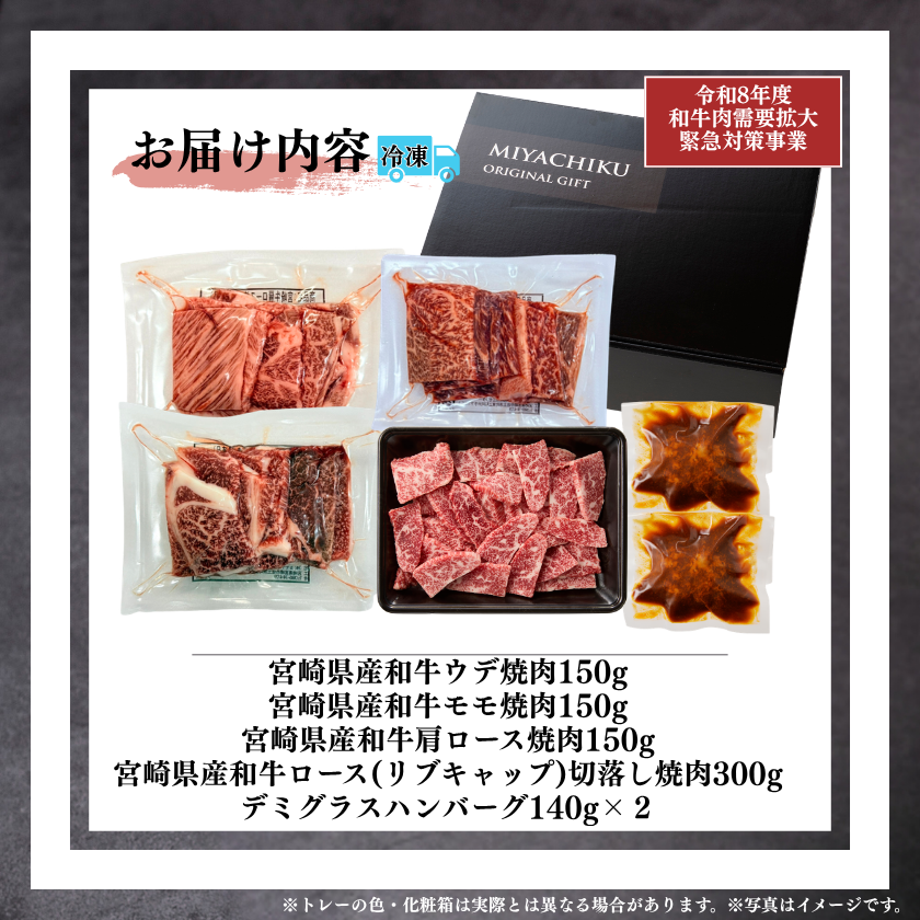 【畜産農家応援】宮崎県産和牛4種焼肉お試しセット750g(デミグラスハンバーグ2個付)【新生活応援フェア2026】