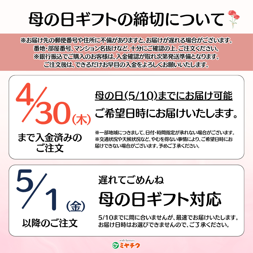 ※4月30日(木)までのご注文で、母の日当日(5/10)までにお届けいたします。