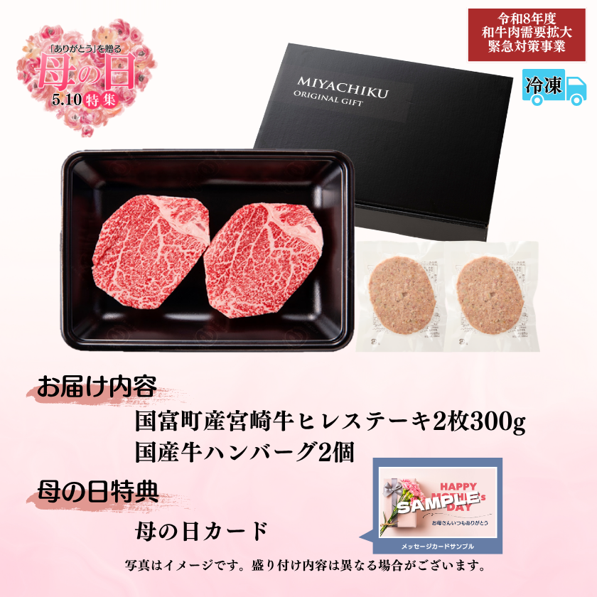 【畜産農家応援】国富町産宮崎牛ヒレステーキ2枚300g(牛ハンバーグ2個付)【母の日】