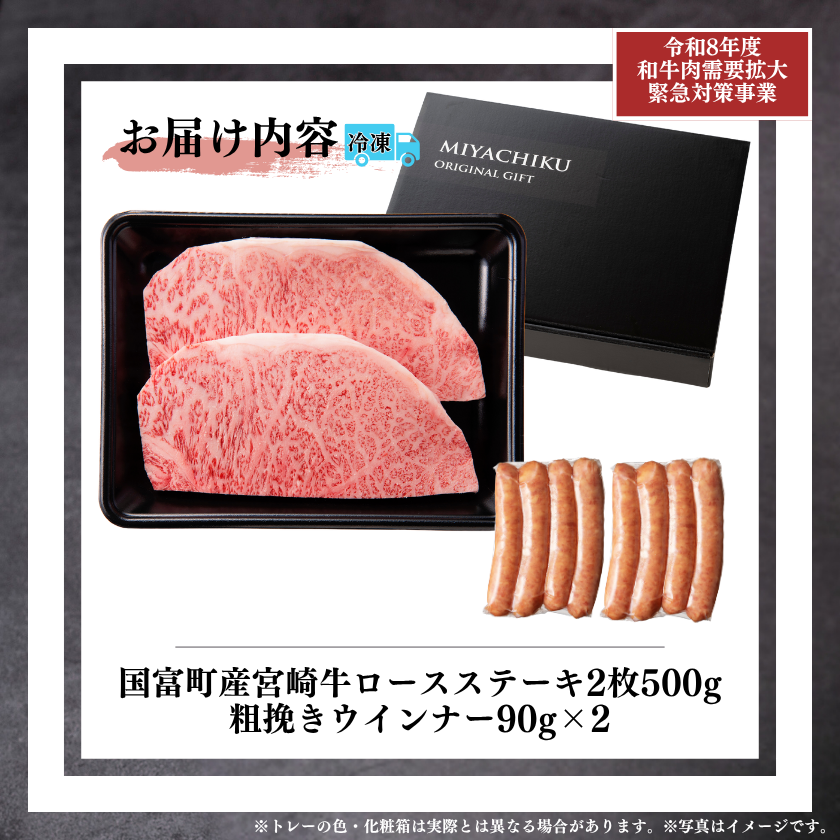 【畜産農家応援】国富町産宮崎牛ロースステーキ2枚500g(粗挽きウインナー付)【新生活応援フェア2026】