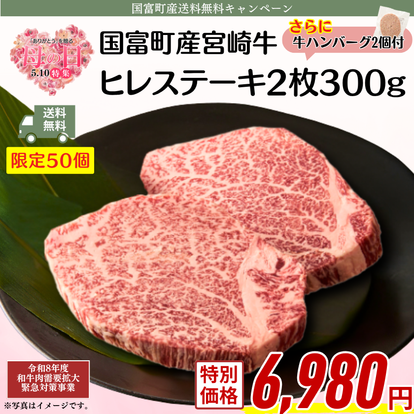 【畜産農家応援】国富町産宮崎牛ヒレステーキ2枚300g(牛ハンバーグ2個付)【母の日】