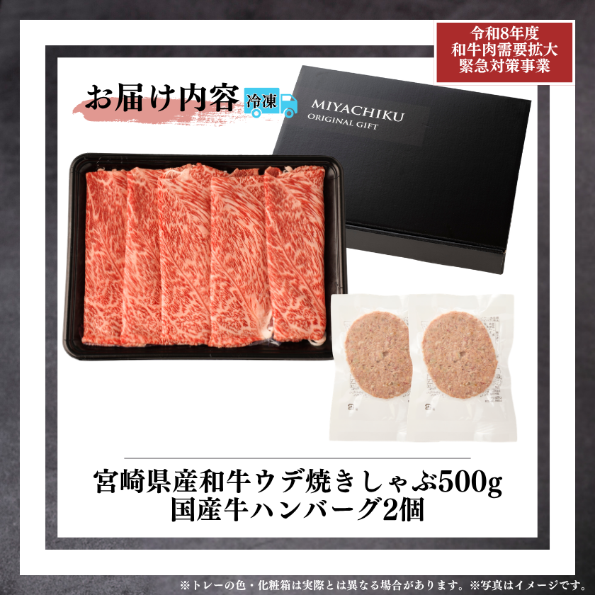 【畜産農家応援】宮崎県産和牛ウデ焼きしゃぶ500g(牛ハンバーグ2個付)【新生活応援フェア2026】